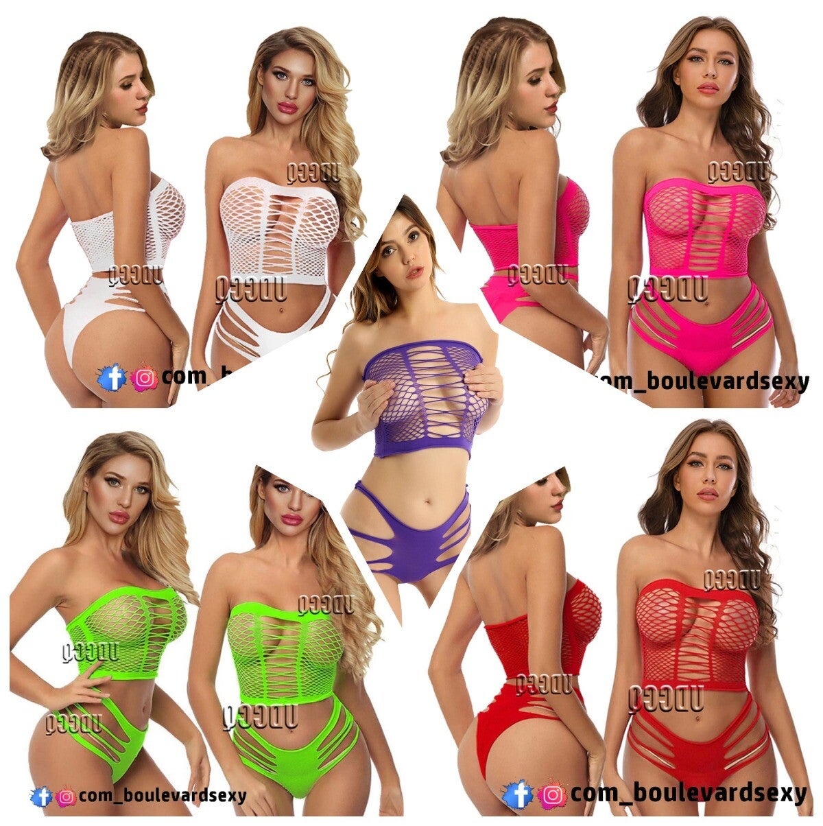 Ensemble lingerie top et shorty en résille, Top bustier avec découpes effet laçage , Culotte/Tanga taille haute ajourée sur les côtés