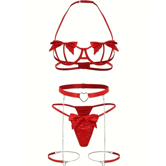Avec : porte-jarretelles, string & soutien-gorge avec nœud papillon et chaîne pour les jambes.